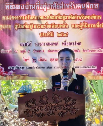 วันจันทร์ ที่ 6 ตุลาคม 2568 เวลา 09.00 น. ดร.ยลดา หวังศุภกิจโกศล นายกองค์การบริหารส่วนจังหวัดนครราชสีมา เป็นประธานในพิธีส่งมอบบ้านเพื่อพัฒนาคุณภาพชีวิตครัวเรือนยากจน หลังที่ 197-200 ตามโครงการ "รวมพลังโชคชัย ร่วมใจบำบัดทุกข์ บำรุงสุข โดยยึดหลักปรัชญาของเศรษฐกิจพอเพียง พัฒนาคุณภาพชีวิตประชาชนอย่างยั่งยืน” โดยมี นายพิชาญ ตราผักแว่น นายอำเภอโชคชัย พร้อมด้วยหัวหน้าส่วนราชการ หน่วยงานองค์กรปกครองส่วนท้องถิ่น -ภาคเอกชน พระสงฆ์ กำนัน ผู้ใหญ่บ้านและ ผู้นำชุมชน 7 ภาคีเครือข่ายงานพัฒนา ร่วมกิจกรรมโดยพร้อมเพียงกัน กิจกรรมส่งมอบบ้านครัวเรือนยากจน จำนวน 4 หลัง ,หลังแรก หลังที่ 197 รายนางสมเพศ พริ้งกระโทก บ้านพะโค หมู่ที่5 ตำบลกระโทก , หลังที่198 รายนางล่าม พากระโทก บ้านพะโค หมู่ที่5 ตำบลกระโทก ,หลังที่ 199 รายนายบัณฑิต ณ สงขลา บ้านปรางค์พะโค หมู่ที่11 ตำบลกระโทก,หลังที่ 200 รายนายชั้น จงกระโทก บ้านใหม่ หมู่ที่10 ตำบลกระโทก เพื่อแก้ไขปัญหาความยากจน ด้านความเป็นอยู่ เพื่อให้ครัวเรือนยากจนเป้าหมาย ได้มีที่อยู่อาศัยที่มั่นคง แข็งแรง มีคุณภาพชีวิตที่ดีขึ้น สามารถดำรงชีพอยู่ได้ตามหลักปรัชฐาของเศรษฐกิจพอเพียงอย่างยั่งยืน